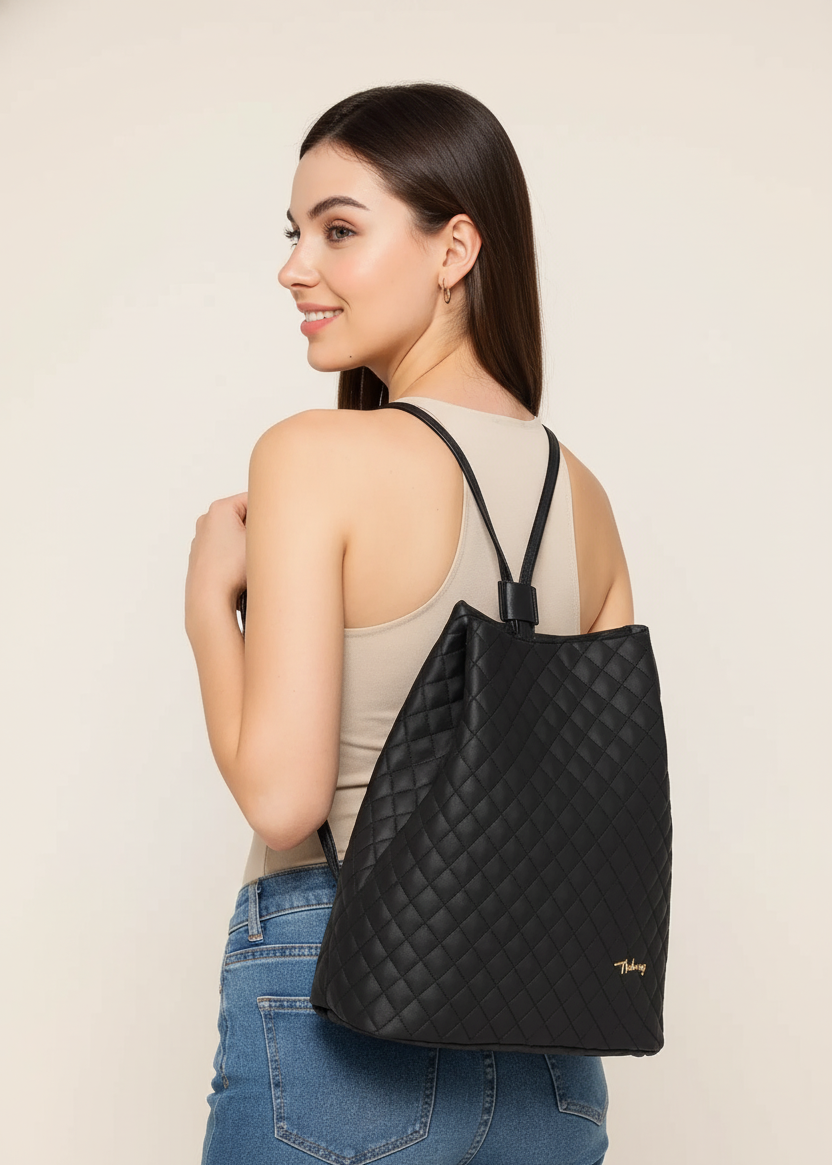 Σακίδιο με δερματίνη καπιτονέ, με διακριτικές χρυσές λεπτομέρειες, που κλείνει με φερμουάρ. Διαθέτει εξωτερική θήκη που κλείνει με αυξομειωτή λουρακι  και τα λουράκια ρυθμίζονται στο επιθυμητό ύψος.