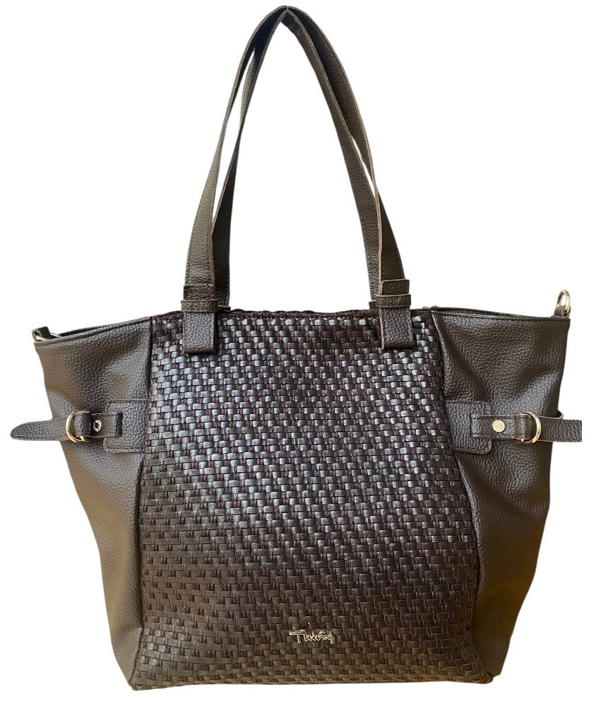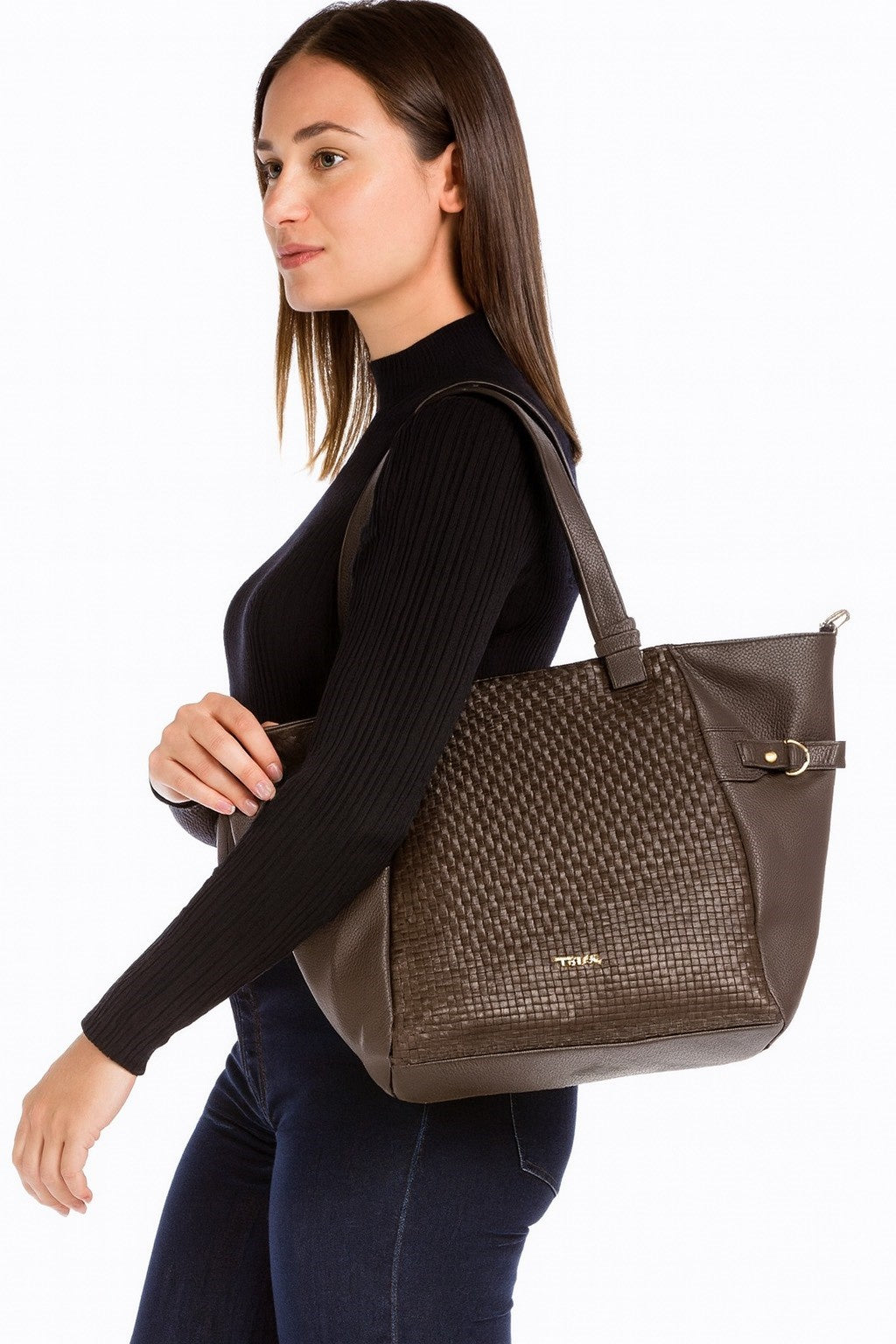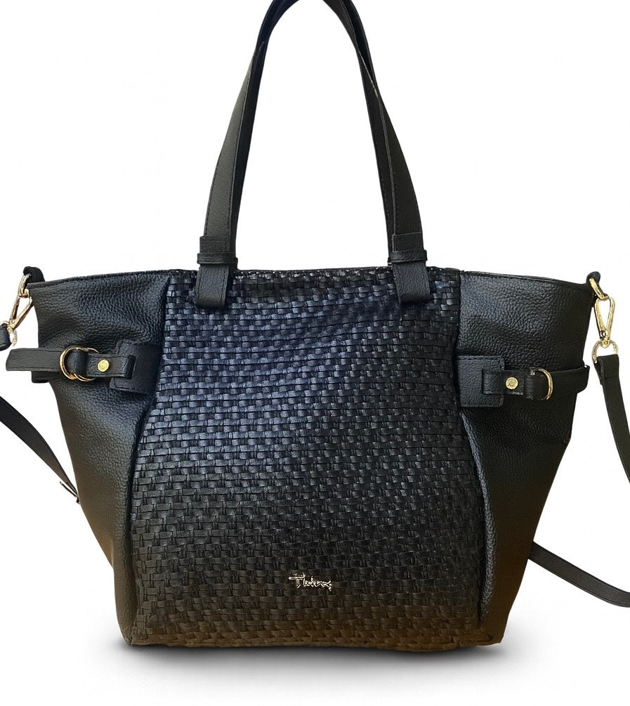 Ευρύχωρη τσάντα ώμου από δέρμα και μαλακό τεχνόδερμα με το σήμα THIROS και με διακριτικές χρυσές λεπτομέρειες. Διαθέτει εσωτερική θήκη, διακοσμητικά λουράκια στο πλάι, είναι φοδραρισμένη και κλείνει με φερμουάρ.