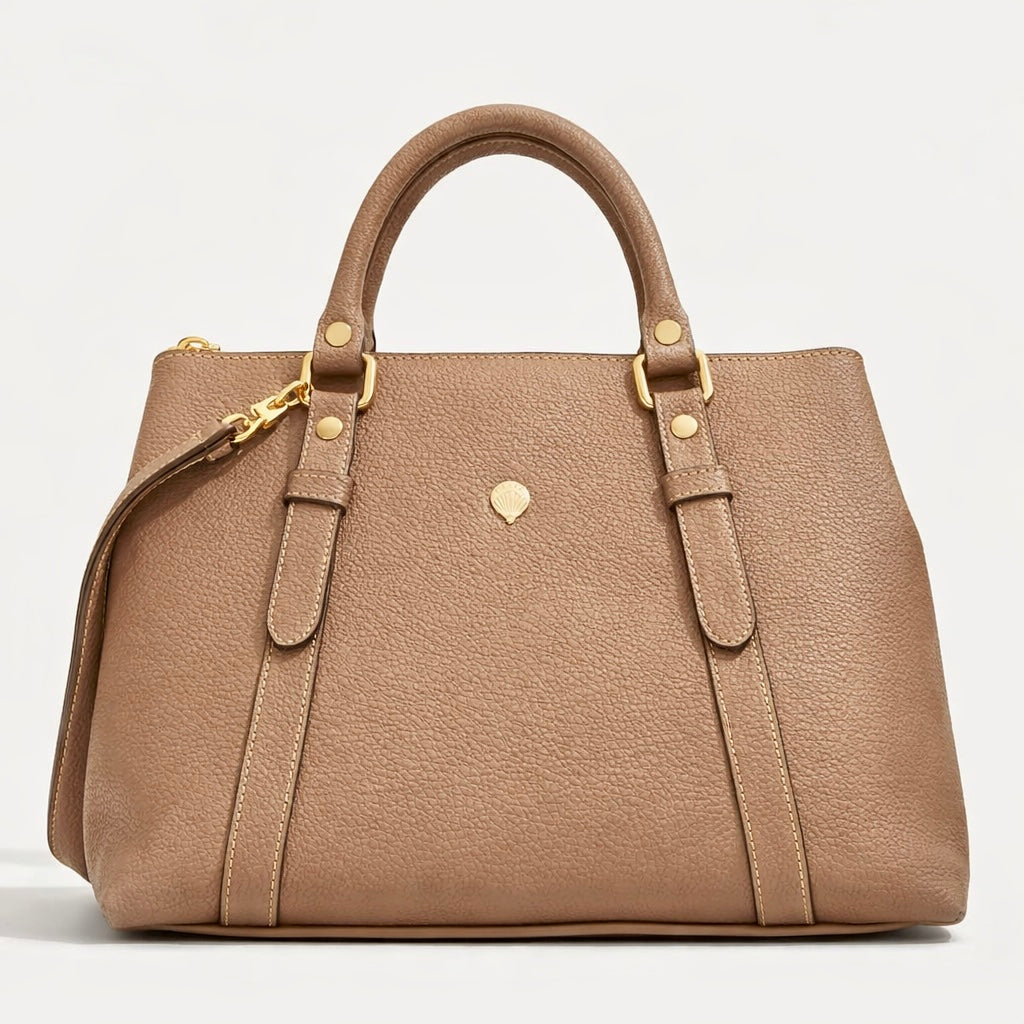 Τσάντα ώμου από μαλακό τεχνητό δέρμα με διακριτικές μεταλλικές λεπτομέρειες και αποσπώμενο λουράκι που ρυθμίζεται στο επιθυμητό ύψος. Κρατιέται στο χέρι, στον ώμο και χιαστή, κλείνει με φερμουάρ, διαθέτει εσωτερικές θήκες για μικροαντικείμενα.