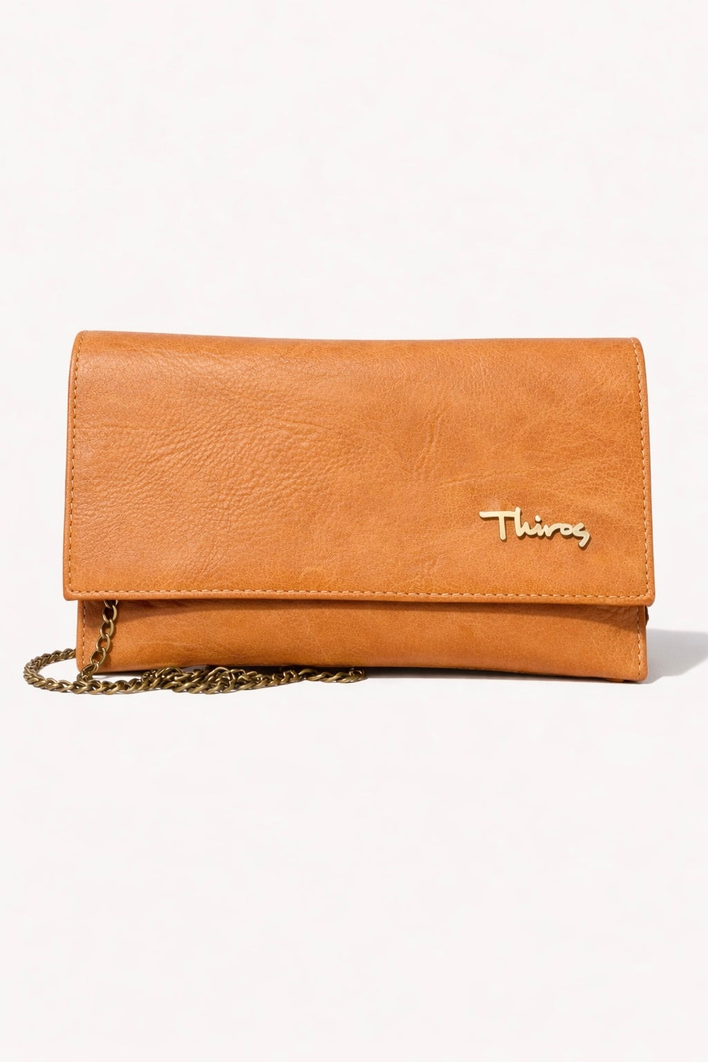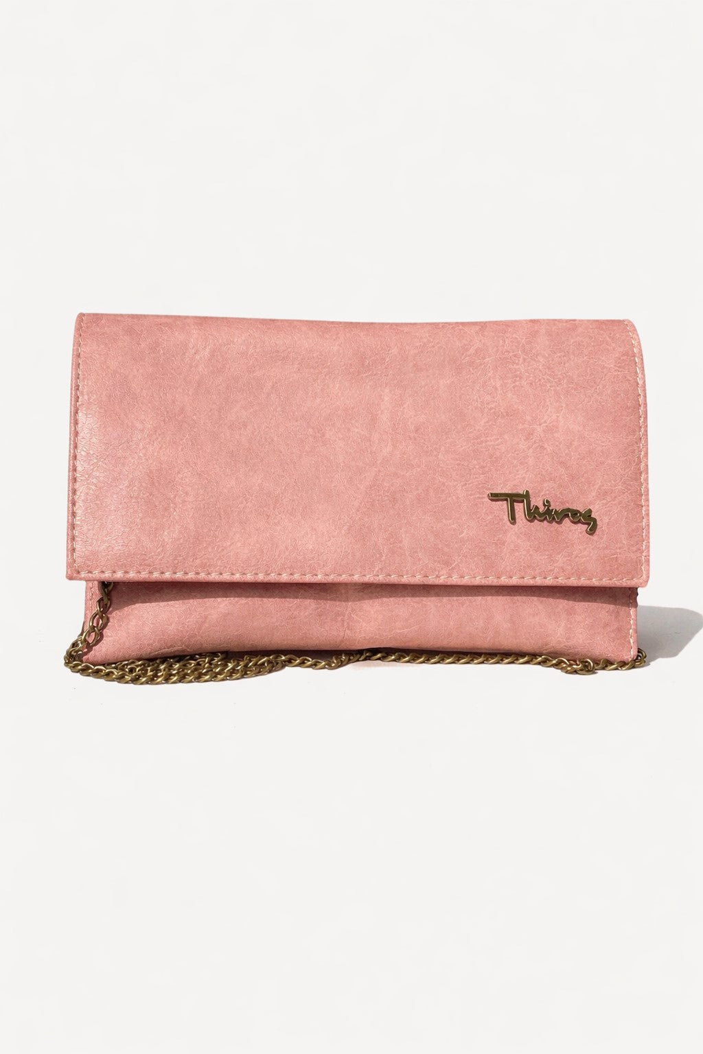 Evening cluth with foldover top with magnetic fastening, made of faux leather, with subtle metallic THIROS logo detail, spacious main compartment and internal zipped pocket.